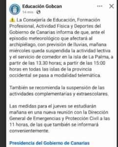 Les informamos que hoy miércoles, día 12/11/2025, no abrirán los centros de orientación en los horarios y lugares indicados a continuación por la Consejería de Educación, Formación Profesional, Actividad Física y Deportes del Gobierno de Canarias.